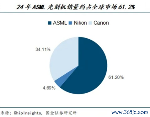 在国金证券看来,光刻机市场呈寡头垄断格局,ASML、Nikon和Canon三家公司长期占据全球光刻机市场的主导地位。其中,ASML凭借其在高端光刻机领域的技术优势,2024年占据了全球光刻机市场61.2%的份额,特别是在EUV光刻机领域,ASML是全球唯一的供应商。尼康和佳能则主要集中在中低端光刻机领域。