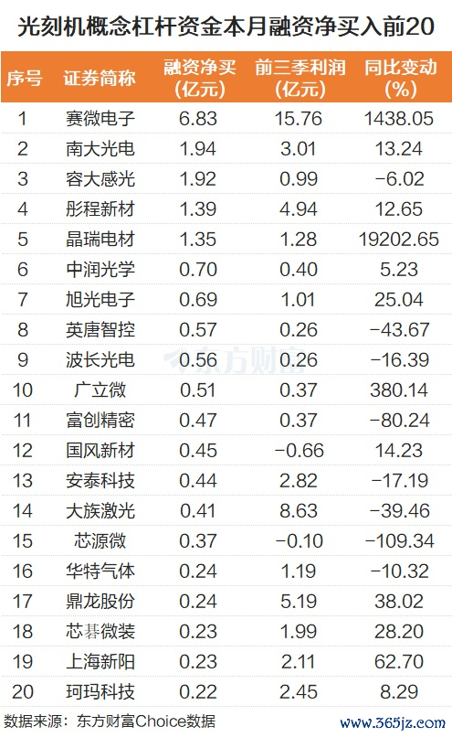 再看杠杆资金,本月杠杆资金融资净流入光刻机板块超7亿元。个股而言,赛微电子为杠杆资金融资净买入最多个股,为6.83亿元。南大光电紧随其后,被融资净买入1.94亿元。容大感光被融资净买入1.92亿元。彤程新材和晶瑞电材也被融资净买入过亿,分别为1.39亿元和1.35亿元。
