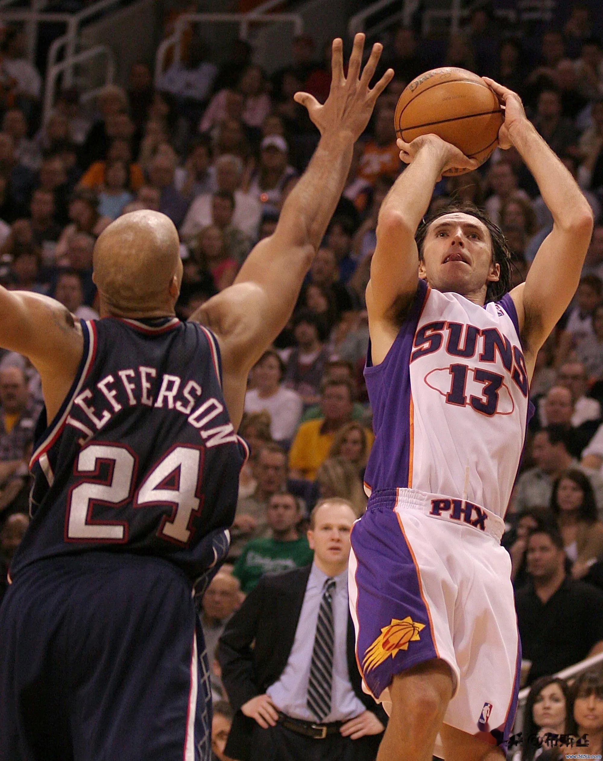 纳什不慌不忙,运到三分线外,突然拔起来。